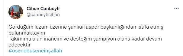 SPOR- Şanlıurfaspor Kulüp Başkanı Cihan Canbeyli, görevinden istifa etti.