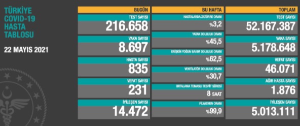 216 bin 658 testte 8 bin 697 kişiye tanı konulmasıyla birlikte toplam vaka sayısı 5 milyon 178 bin 648'e yükseldi.