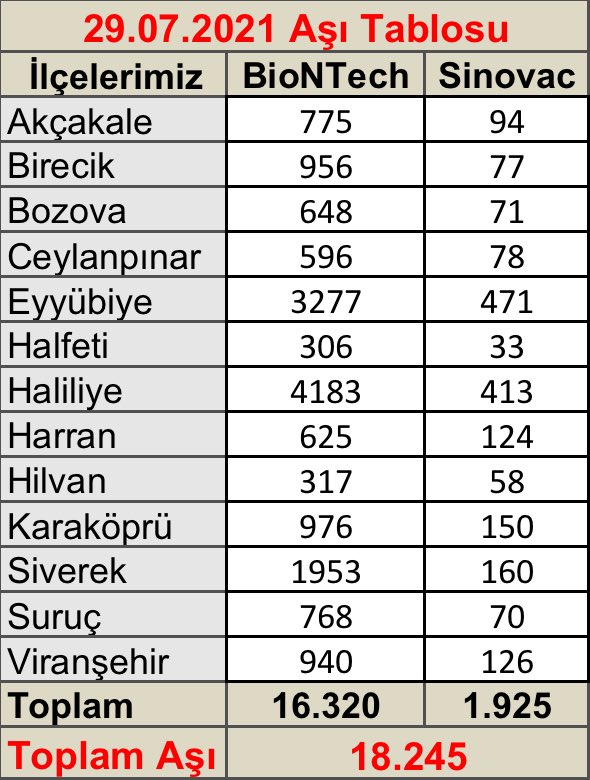 Şanlıurfa Türkiye'de aşılama çalışmalarından en az olan kişi sayısıyla son sıralarda yer alıyor. Şanlıurfa yapılan bütün çağrı ve kampanyalara rağmen hala son sıralardaki yerini koruyor.