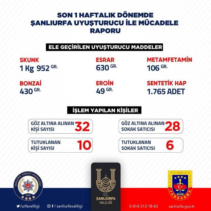 Şanlıurfa İl Emniyet Müdürlüğü ve İl Jandarma Komutanlığı ekipleri tarafından son bir haftada kent genelinde uyuşturucu ile mücadeleye yönelik gerçekleştirilen operasyon çalışmaları sonucunda;