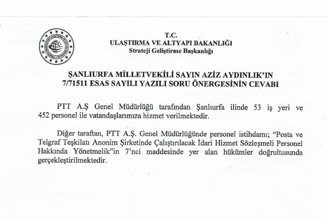 Cumhuriyet Halk Partisi Şanlıurfa Milletvekili Aziz Aydınlık, Şanlıurfa Merkez ve İlçelerinde uzayıp giden PTT Kuyruklarını gündeme taşıyarak Ulaştırma ve Altyapı Bakanı Adil Karaismailoğlu’nun yanıtlaması istemiyle yazılı soru önergesini TBMM Başkanlığı’na sunmuştu.