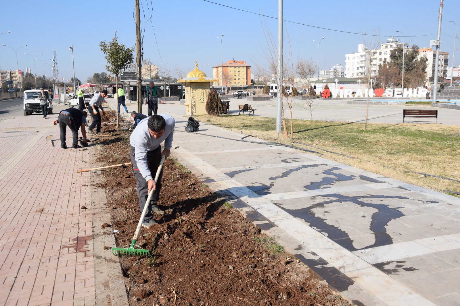 Gül dikim işlemleri dışında ekipler, caddesi üzerinde bulunan kavşak ve orta refüjlerde toprağın gül ve çiçek dikimine uygun hale gelmesi için tesviye çalışmalarını da sürdürüyor.