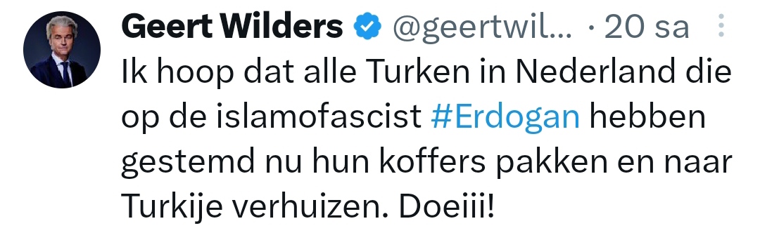 HOLLANDA- Hollandalı siyasetçi Geert Wilders Türklere karşı nefret dolu sözler söyledi. 28 Mayıs Cumhurbaşkanlık seçimlerinin ardından Erdoğan'a oy veren Türklere karşı sosyal medya hesabı üzerinden bir paylaşımda bulundu.