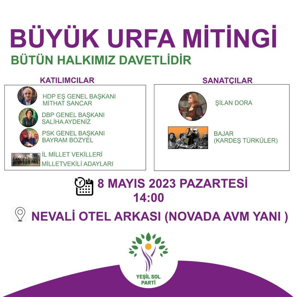 Yeşil Sol Parti, HDP Eş Genel Başkanı ve Şanlıurfa Milletvekili adayı Mithat Sancar, DBP Genel Başkanı Saliha Aydeniz, PSK Genel Başkanı Bayram Bozyel, Şanlıurfa Milletvekilleri ve milletvekili adaylarının katılımıyla toplama merkezi yanındaki alanda miting düzenleyecek.