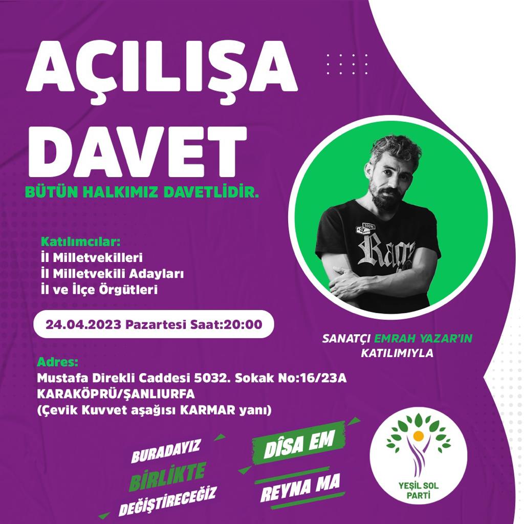 Seçimlerin yaklaşmasıyla birlikte çalışmalarını hızlandıran siyasi partiler, seçim bürosu açılışlarını da yapıyor. Sahada dikkat çeken partilerden olan Yeşil Sol Partisi Karaköprü’de seçim irtibat bürosu açılışı yapmaya hazırlanıyor. 24.04 2023 Pazartesi günü saat 20:00’de açılacak olan seçim irtibat bürosunun açılış törenine sanatçı Emrah Yazar da katılacak.