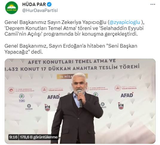 HÜDA PAR’ın resmi sosyal medya hesabından yapılan açıklamada, “Genel Başkanımız, Sayın Erdoğan’a hitaben ‘Seni Başkan Yapacağız’ dedi.” ifadeleri kullanıldı.