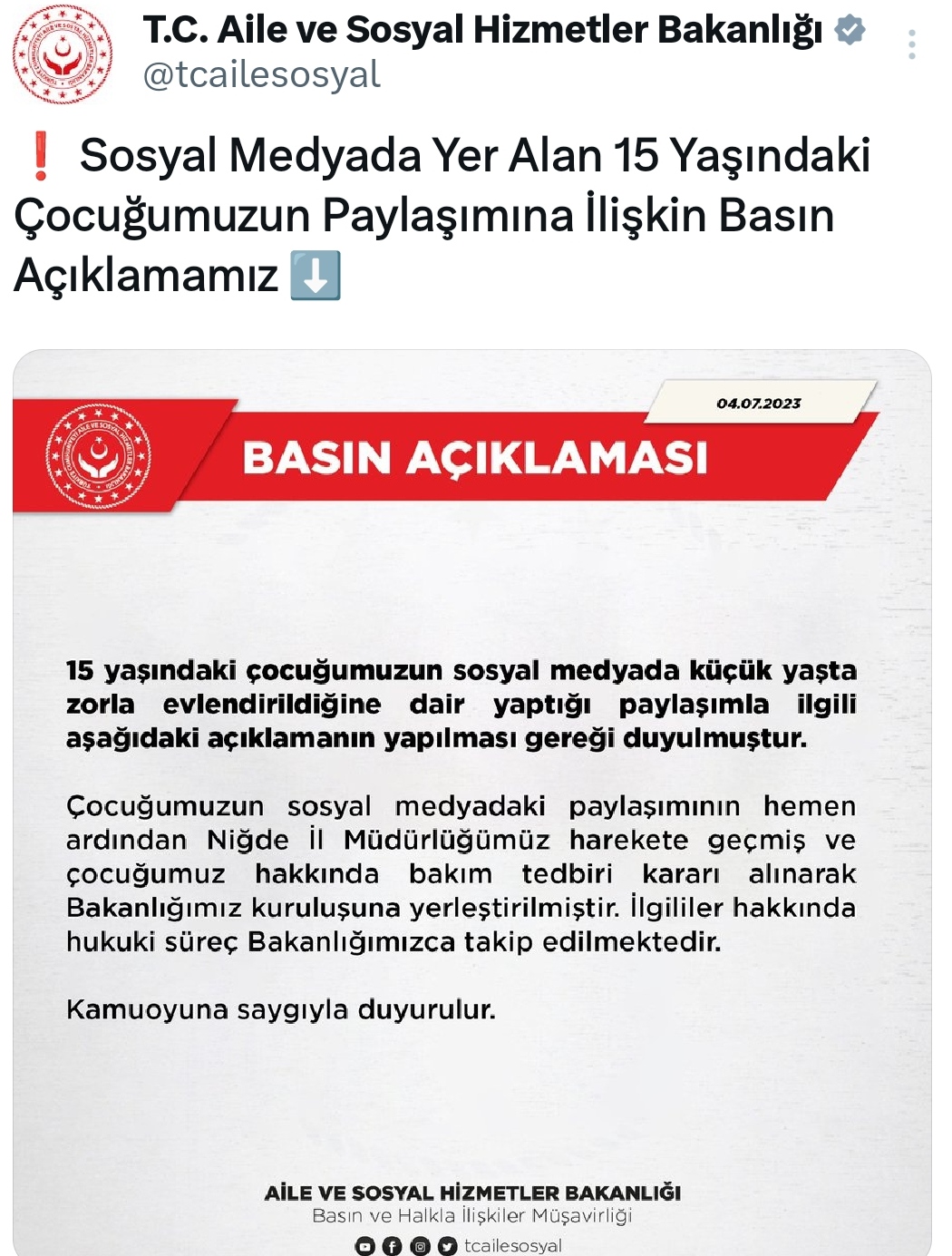 Çocuğumuzun sosyal medyadaki paylaşımının hemen ardından Niğde il Müdürlüğümüz harekete geçmiş ve çocuğumuz hakkında bakım tedbiri kararı alınarak Bakanlığımız kuruluşuna yerleştirilmiştir. İlgililer hakkında hukuki süreç Bakanlığımızca takip edilmektedir.